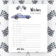 レースカーテーマベビーシャワー招待カード紫(紫)ヴィンテージカーと黒 – 白のレースフラグの水色のイラストを搭載。「赤ん坊のシャワーを求めて走り回る」