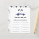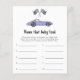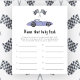 レースカーテーマベビーシャワー招待カード紫(紫)ヴィンテージカーと黒 – 白のレースフラグの水色のイラストを搭載。「赤ん坊のシャワーを求めて走り回る」