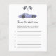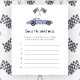 レースカーテーマベビーシャワー招待カード紫(紫)ヴィンテージカーと黒 – 白のレースフラグの水色のイラストを搭載。「赤ん坊のシャワーを求めて走り回る」