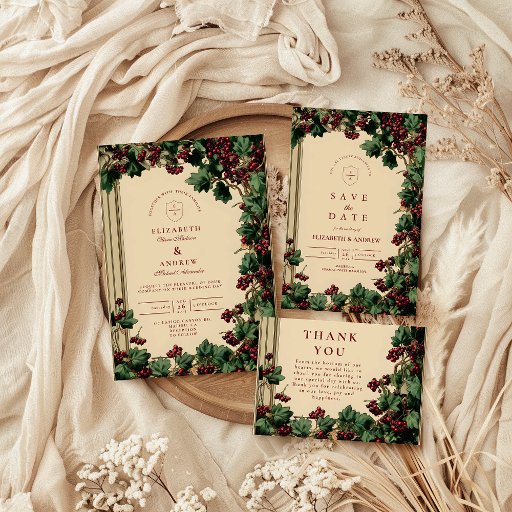 このロマンチックなツタとベリーのデザインであなたの大きな日にタイムレスなエレガンスを結婚もたらす。深いの緑の離れツタの詳細と豊かな赤い果実のクラスタは、クラシックと魅惑の両方のヴィンテージ植物性スタイルにあなたのを形成する。カップルの伝統的結婚式、素朴な、または冬の結婚式を計画するのに最適な、このデザインは自然な美しいと旧世界の魅力をブレンド。忘れられないお祝いのトーンを設定するキープサケ素晴らしーの名前、日付、場所でパーソナライズ。