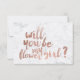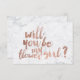 モダンでオリジナル、そして洗練された筆記体のタイポグラフィーが、偽のローズゴールドの葉の装飾で「私のフラワーガールになってくれますか?」というカードを、エレガントでシンプルな白いトレンディな大理石の背景にデザインしました