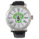 サッカーファンの腕時計。緑と黄色のシャツとサッカーシャツのデザイン。選択した名前と番号を追加する。時計の顔はローマ数字だ。