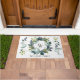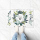 お客様をスタイルに、田舎のパーソナライズされたテーマのドアマットで。デザインエレガントテンプレートこのエレガントデザインテンプレートは、白い灰色の風化木の背景に手水色の緑の月桂樹リースを特徴とする。リースの中心には、ファミリ名の下に個人用のイニシャルがあります。