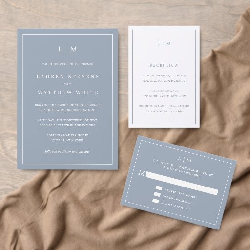まだシンプルデザインをフィーチャーしたの折り畳み式プモダンログラムエレガント。カバーは、ほこりっぽい青い背景の上にあなたのイニシャルモノグラム結婚と一緒にあなたの詳細の白で白を持っている。中には結婚式のパーティが離れ横に並び、式の順番は右側に並んでいる。裏には君の個人的な感謝していメッセージがある。すべてのデザイン要素の色は、デザイン編集ツールで変更できる。ミニマルスタイリッシュなカップルのためのシックで素晴らしデザイン。
