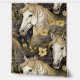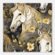 木炭の黒い背景に流れるマネや花の金ゴールドを持つ水色の野生の馬。