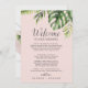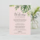 これらの野生のヤシの赤面歓迎レターの旅程とマップカードは、目的地の結婚式の歓迎バッグに最適である。このデザインは、熱帯の夏のための赤面のピンクの背景に葉、緑の水色のバナナヤシの木の、シダ、葉、植物植物や緑のエキゾチックな配列を備えて感じいる。カードの正面にはウェルカムレターと旅程が並んでいる。カードの背面に記載された鍵の場所を持つリゾートの地図を含める。