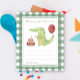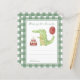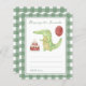水彩子供の誕生日パーティー。水の色ワニまたはアリゲーター、キャンドルとケーキ、赤いバルーン。緑のケージの背景。
