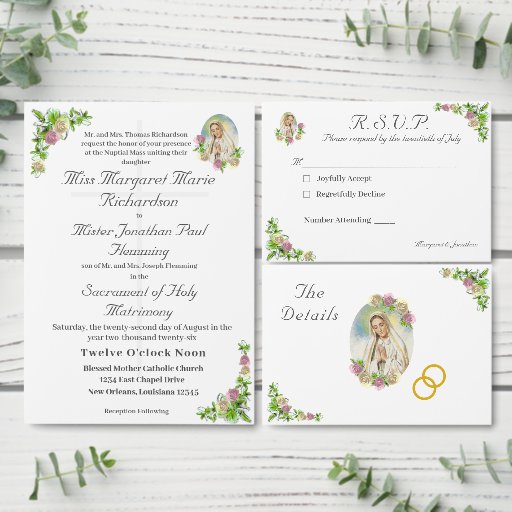 デザインフロントは、ファティマの女性の美しいイメージを中心に楕円形として特徴。繊細なピンクと白のバラの型枠フレーム。金の輪が結婚結合した像が下に楕円形に離れ表示される。カスタマイズ可能な見出しをナプティエレガントカルフォントで表示。の上と縁ど下の右離れ角はバラと緑のイメージである。[反転]は、テキストをシルバーカラーのフォントで表示する。披露宴見出しと宿泊見出しは両方とも同じNuptialフォントに掲載されている。以下の情報は、簡単間澄んのプリントに表読示される。「ヴァージン・メアリ・カソリッ結婚クのスイート」と連携するように設計。