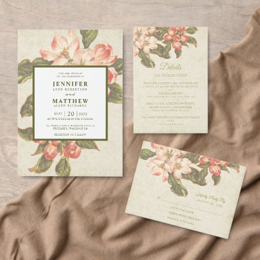 この美しいリンゴの花の結婚式用シールは、外縁に沿って湾曲した緑の文字に新郎新婦の名前とパーチメントのダマスクの背景にヴィンテージのリンゴの花のスケッチを特徴としている。