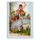ヴィンテージイースターのカードの画像は、2人の子供の遊と、大きな色のイースターの卵の上で笑うウッドランドのシーンを描く。子羊は首にフローラリースを付けのまわりにて彼らの横を楽しむ。男の子は花のかごを持ち、女の子は手に花の枝を空中に持ち上げる。カードの前には「イースター挨拶」と書かれており、メッセージの中には「ハッピーイースター、ハッピー春、ハッピー、ハッピー、すべてをハッピー!」と書かれている。