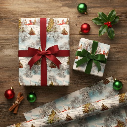このラッピング紙は、輝く冬のシーンの繰り返しシームレスなパターンを備えているヴィンテージ。デザインは丘の上に雪が積もった雪の風景転がや、雪で覆われた常緑樹、背景に尖塔が立ち並ぶ風変わりな赤い教会などを描いている。前景は大きな木の枝に霜の降りた支配され、奥行きと質感が加わる。全体的な効果魅力的は伝統的、クラシックのクリスマスカードを思わせる、フェスティバルを高めるために微妙な輝きを持つ、冬の感じように。