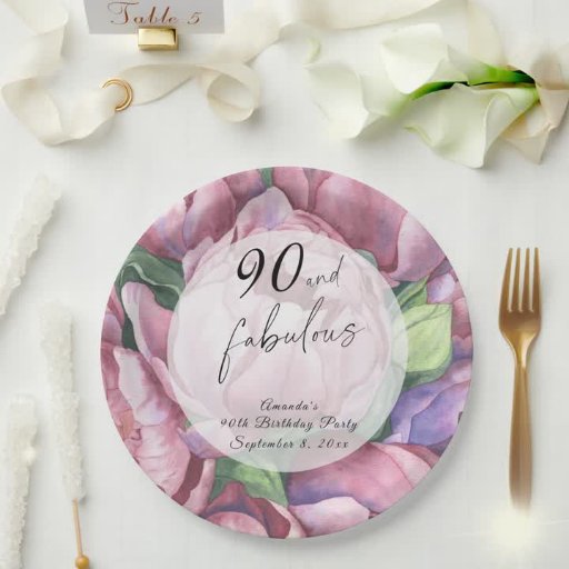 ヴィンテージフローラ第90回バースデーパーティーへの招待90 & Fabulousスクリプトと水の色の牡丹スタイリッシュ(牡丹のバラ)で特集。