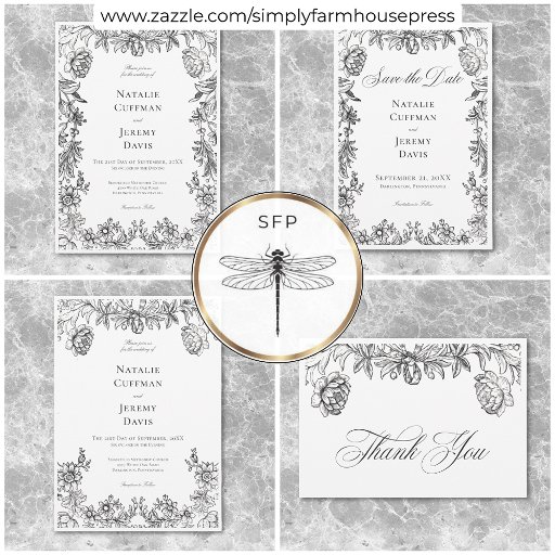 このヴィンテージフローラ結婚式招待状は、花とスタイルの黒と白のタペストリーのイラストレーションを特徴とし、鮮明な白の中心をフレーミングし離れて、時代を超えたエレガンスを特別な日にもたらす。複雑な植物縁どは、クラシック、家宝感じ、庭伝統的やヴィンテージ結婚式に最適な追加する。Simple Farmhouse Pressによって作成。商品のカスタム購入や商品のリクエストについては、simplyfarmhousepress@gmail.comまでご連絡ください。