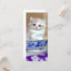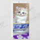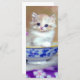 フワフワの白い子猫のカード!青い目の子猫は、ピンクの花が咲く青い鉢の中に座っている。紫の花の毛布を前に垂らす。猫好きや美術愛好家の素晴ビクトリアンらしい贈り物!