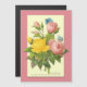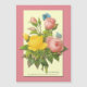有名なアーティストPierre Redouteのピンクと黄色のバラの花の植物画のアンティーク再現を持つマグネットカードと青い蝶のピンクの背景。