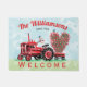 古い赤いヴィンテージ農園トラクターが車に2つのブルーバードを乗せたフローラハートを引っ張り、青い空と緑の草の夏のシーンを背景にしたウェルカムマット。トラクター上の文字読「20xx以来ウィリアムソンズ」。自分の家族の名前と年でパーソナライズし、トラクターの下の読文字"歓迎"。世界的に有名なアーティストのティム・コーフィーがデザイン。