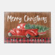 ヴィンテージ赤素朴トラック素朴な木の背景にクリスマスツリーとパーソナライズされたあなたの家族の名前で。お前のパーソナライズされた名字が合う。メリー書スクは手かわいらしで文字のタイポグラフィ。家族や友人を家に迎え入れる素敵な方法は何だろう!
