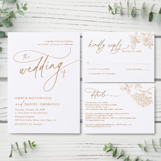 ヴィンテージ金ゴールドモダンフローラスクリプト結婚の写真 招待状