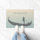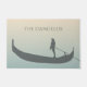 ヴェネチパーソナライズされたアスタイルのtouchを入り口に追加。ゴンドラとゴンドラのシルエットスタイルイラストレーションを薄黄金色と薄青色の夕焼けの背景に対してグレーのセットで有するマットまたはウェルカムマット。グレーのレタリングは名前パーソナライズされたまたは他の文字で準備ができている。