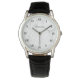 名前をカスタムするまたはモノグラムのイニシャル文字と古典的な男性の時計ギフトアイディア。白い大理石の背景テクスチファンシーャを持つ豪華なスクリプトタイポグラフィテンプレート。現クールパーソナライズされた在の誕生日、父の日または退職パーティー。パパ、叔父、兄、父、夫、おじいちゃん、祖父、ステップパパ、息子、新郎、groomsmenなど、自分で自分を作る。ローマ数字ダイヤルプレート。豪華男らしなデザインのデザイン。ブラックレザーバンド。