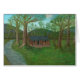 流れの隣の丸太小屋のパステル調の絵画。 小屋は背景の山が付いている木によって囲まれます。