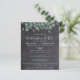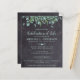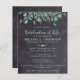 素朴追悼式/人生のお祝い招待状。これらの悔やみや弔慰葬儀招待状はモダン、素朴な黒板石板デザインにユエレガントーカリプタスの植物性の緑を特徴とする。あなたの愛する人の名前と日付、イベント詳細と人生の葬儀の招待のこのお祝いをパーソナライズ。COPYRIGHT © 2021 Judy Burrows, Black Dog Art - All Rights Reserved.予算お祝いのライフ素朴ユーカリプタス