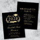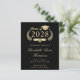 現代的で費用対効果の高い黒の大学卒業パーティー招待状で、ゴールドのラウレルリースの中に「Class of」が描かれ、卒業帽のトッパーと卒業証書、エレガントなライトゴールドのスクリプトで卒業生の名前が記されている。学校、専攻、功績、または将来の計画とパーティーの詳細をシンプルなゴールドのタイポグラフィーで追加。