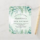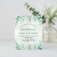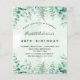 40歳(または任意の年齢)の誕生日パーティーのためのトレンディーの招待、魅惑的な森のテーマ。シダとユーカリの緑を持つ緑の水色の背景。名前は手書文字のスタイルスモダンクリプト付き。カスタマイズしてパーティー詳細を追加する。