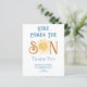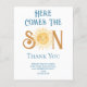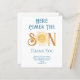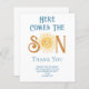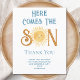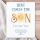 この予算の男の子の赤ちゃんシャワーサンキューカードは、青来色のレトロなタイポグラフィの文字"ここザ・ソン"笑顔の黄色い水色の太陽を特徴とする。簡単にカスタマイズ可能オリジナル水彩©ミケーレ・デイヴィス。
