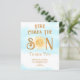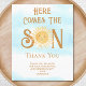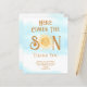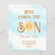 この予算の男の子の赤ちゃんシャワーサンキューカードは、笑顔の水の色の太陽と青い空と雲とスタイリッシュタイポグラフィの文字来「ここザ・ソン」を特色としている。簡単にカスタマイズ可能我々は我々のアートワークを作成するので、あなたは他のデザイナーからの正確な画像を見つけることができない。オリジナル水彩©ミケーレ・デイヴィス。