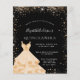 15モダン歳のスタイリッシュ誕生日パーティー、キンセアニラへの魅力的な招待。シックな黒の背景フェイクと金ゴールドグリッターの塵とドレス。名前は手書文字のスタイルスモダンクリプト付き。カスタマイズしてパーティー詳細を追加する。