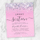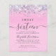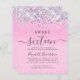 ピンク色の背景に対して輝くホログラフィックパープル、ピンクとシルバーのグリッター紙吹雪とソフトグレーのタイポグラフィとスワッシュとトレンディーのスクリプトの組み合わせフェイクで「Sweet sixteen」と共にエレガント、予算16thのバースデーパーティーの招待。