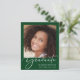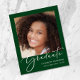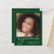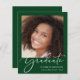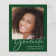 白いモダン台本にフレンドリー「卒業」と写真を収めた予算と緑の卒業発表と彼女の名前、学校とクラスの年を含む白いタイポグラフィでシンプル。