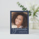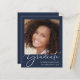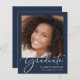 白いモダン台本にフレンドリー「卒業生」を描いたバジェット・ダークエレガント・ブルーの卒業発表と彼女の写真と彼女の名前、学校とクラスの年を含む白いタイポグラフィでシンプルの発表。
