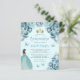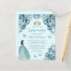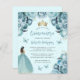 この素敵なキンチェニェラの招待縁どは、ターコイズの背景にターコイズの水の色の花を淡い色の特色とする。金ゴールドティアラ、ターコイズプリンセスドレスと小さなターコイズ蝶の文字に暗い髪の女飾の子。"Quinceaenera"という言葉と名誉のゲストの名前はエレガント、ターコイズの手書きスクリプトに現れ、残りの文字は灰色のサンセリフフォントで表示される。