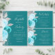 この離れ結婚式招待状の手の端はグリッターの花束をターコイズの色合いと軽い青の色合いで備えモダン、銀箔とグリッターの葉をトリミングし、銀を散らフェイクす。カスタマイズ可能な文字は淡い色の、ターコイズの背景にシルバーグレーの手書きスクリプト、コピープレートおよび斜体のフォントを組み合わせている。裏面はマッチングターコイズと銀フローラデザインを備える。
