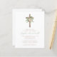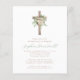 このエレガントバプテスマの招待は、アイボリーバラの水色の花束、バラの金ゴールドの葉とユーカリの緑のシンプル上、茶色のイタリックフォントの"私たちの娘のバプテスマのために私たちに参加してください"という言葉の上に表示される。白い背景に茶色のサンセリフフォントの詳細を付けた緑色の繊細な手書き書で彼女の名前でパーソナライズ。女の子のバプテスマに理想的。