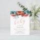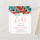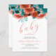 サンゴとティール(緑がかった色)の花と縁ど葉のトップを特徴とする甘い赤ちゃんシャワー。下のコーラル手書き文字には、「開花のベビー」というエレガント言葉が現れている。文字をカスタマイズするには、coralスクリプトのmom-to-beの名前と、白い背景の上の木炭グレーのサンセリフフォントの詳細を。