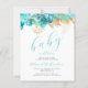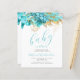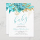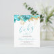 この甘い赤ちゃんシャワー招待縁どは、ターコイズと金ゴールドの花と葉のトップを特色にする。下の「開花のベビー」はピンクの手書きエレガントスクリプトに現れる。文字をカスタマイズするには、ターコイズスクリプト内のmom-to-beの名前と、白い背景の木炭グレーのsans serifフォントの詳細の名前を使用する。