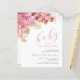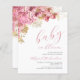 ピンクと金ゴールドの花と葉の青々とした花束を特徴とする甘い赤ちゃんシャワー招待。下の「開花のベビー」はピンクの手書きエレガントスクリプトに現れる。文字をカスタマイズするには、mom-to-beの名前をピンクのスクリプトで、詳細を炭の灰色のサンセリフフォントで白い背景に。