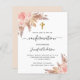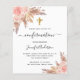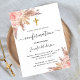 シックな白い背景。バラ飾金ゴールドと赤面ピンクの花模様、バラ、パンパスグラスと黄金の十字架。名前と詳細のパーソナライズおよび追加