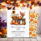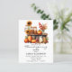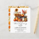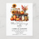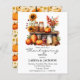 カボチャ、ひまわり、トウモロコシと小麦を前面に、カラフルのピンクがかったオレンジ色のカボチャを背面に持つバスケットを持つかわいい感謝祭のイラストレーション。この招待状はディナー詳細でパーソナライズできる。