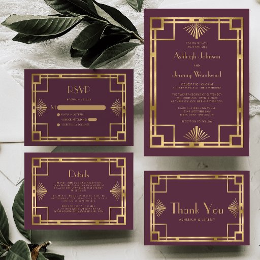 このエレガントヴィンテージインスパイア結婚式招待状は、長方形の幾何学的ヴィンテージアートデコデザインで囲まれた赤い背景に金ゴールド色の文字を備えている。コーディネート金ゴールドとブルゴーニュのアート飾デコファンのパターンのカードの背面。