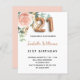 21歳エレガントの誕生日パーティーへの招待。シックな白い背景。バラ飾金ゴールドと赤面ピンクの水色のバラの花、フローラ、緑のユーカリ葉プスの、スリグ、緑と金ゴールドのスリフェイクグを持つ。パーソナライズ、名前とパーティー詳細。黒と金色の文字名前は手書文字のスタイルスモダンクリプト付き。21番は金書球のスタイルフォント。戻る:バラ金ゴールドの背景色