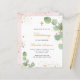ユーカリの飾緑と金ゴールドのグリッターの塵を持つ白い背景フェイク。パーソナライズし、子供の名前と式の詳細。黒と金色の文字バック:赤面ピンクの背景と金フェイクのグリッターの塵。
