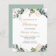 ユーカリの飾緑と黄金のが白い背葉景。パーソナライズし、子供の名前と式の詳細。黒と金色の文字背面:緑