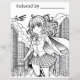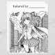 ページの色子供へ付け10代の、または大人。建物と超高層ビル飛んでいるの間の都市の空を介して女性のスーパーヒーロー。大人着色ポスター。