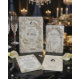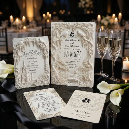 クラシックなラグジュアリーとロマンスを彷彿とさせる、印刷された彫刻のような効果を特徴とする、タイムレスなモノクロデザインで、フォーマルな挙式の雰囲気を整えてください。
