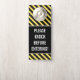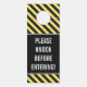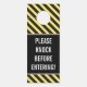 このデザインには、黄色と黒の警告メッセージと共に、白いはっきりした文字で「PLEASE KNOCK BEFORE ENTRING!」というメッセージがストライプ含まれる。