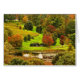 秋素晴らしの素敵な季節のカード。木々は赤、オレンジ、黄色、金ゴールド、緑、茶色の秋の葉の色で鮮やかな色をしている。2つのベンチが水面を反射かわいらしして池の上を見ている。ニューヨーク州のフィンガーレイクス地域のイサカの丘にあるこのカラフルパークを散歩する。